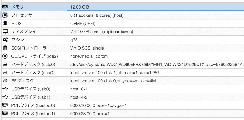 メモリ:12.00GiB, プロセッサ:8 (1 sockets, 8 cores), BIOS OVMF(UEFI), マシン:q35
