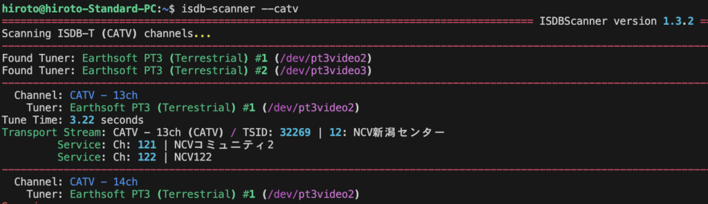 isdb-scanner --catvの–catvオプションを追加すると、地上波スキャンで地上波(T13ch ~ T62ch)の代わりにISDB-T C13ch ~ C63chをスキャンします。